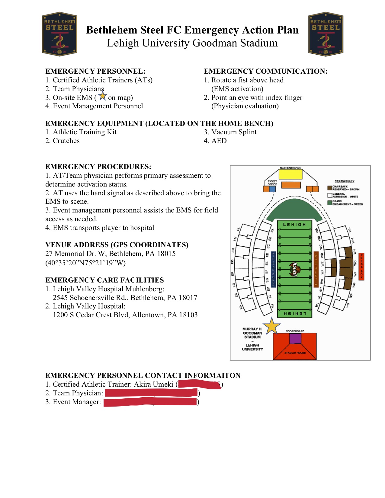 緊急時における対応者の名前が含まれます。多くの場合はアスレティックトレーナーやチームドクターが含まれ、アスレティックトレーニングを学ぶ学生が含まれることもあります。