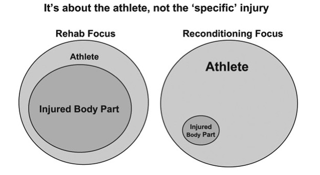 私が以前の働いていた職場では、リハビリに変わる言葉としてリコンディショニング (Reconditioning)という言葉がよく使われており、さらにいうとAthletic Reconditioning Modelという考え方のもと、受傷から競技復帰及びトップフォームへの継続的なサポートが行われていました。