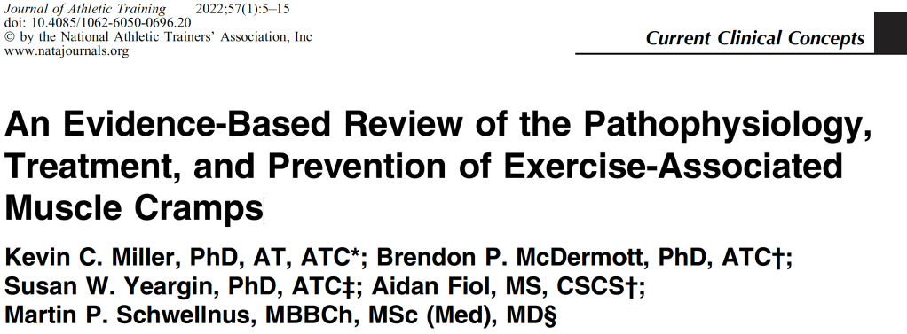 Miller, K. C., McDermott, B. P., Yeargin, S. W., Fiol, A., & Schwellnus, M. P. (2021). An Evidence-Based Review of the Pathophysiology, Treatment, and Prevention of Exercise Associated Muscle Cramps. Journal of Athletic Training. https://doi.org/10.4085/1062-6050-0696.20
