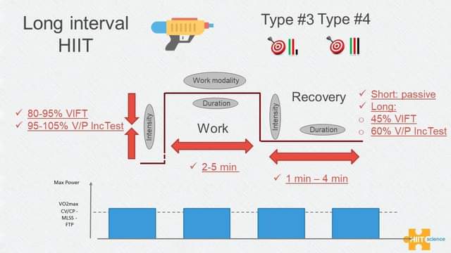 Long IntervalsはHIITタイプ3 (有酸素+無酸素)及びHIIT タイプ4(有酸素+無酸素+神経筋)の”武器”として応用することができます。